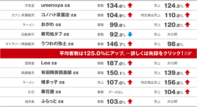 いちばん知りたいのはどれだけ効果があるのかですよね。のぼり旗を立てたはいいけど 全く効果が出ないというのでは困ります。そこで、モニター10店舗さまのご協力をいただき、データを集めました。